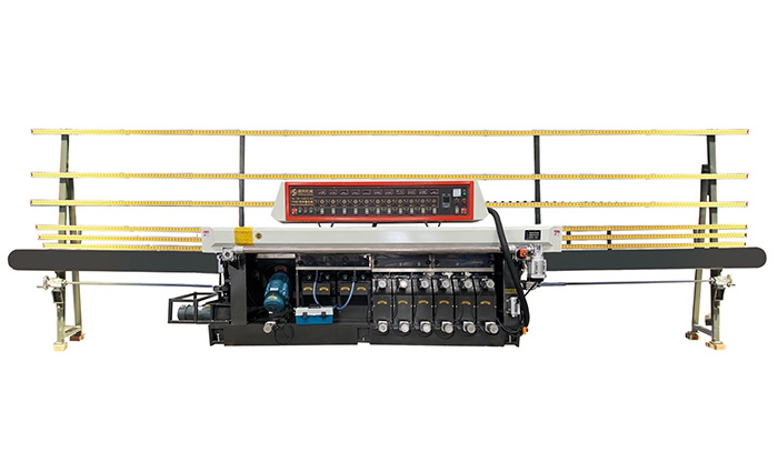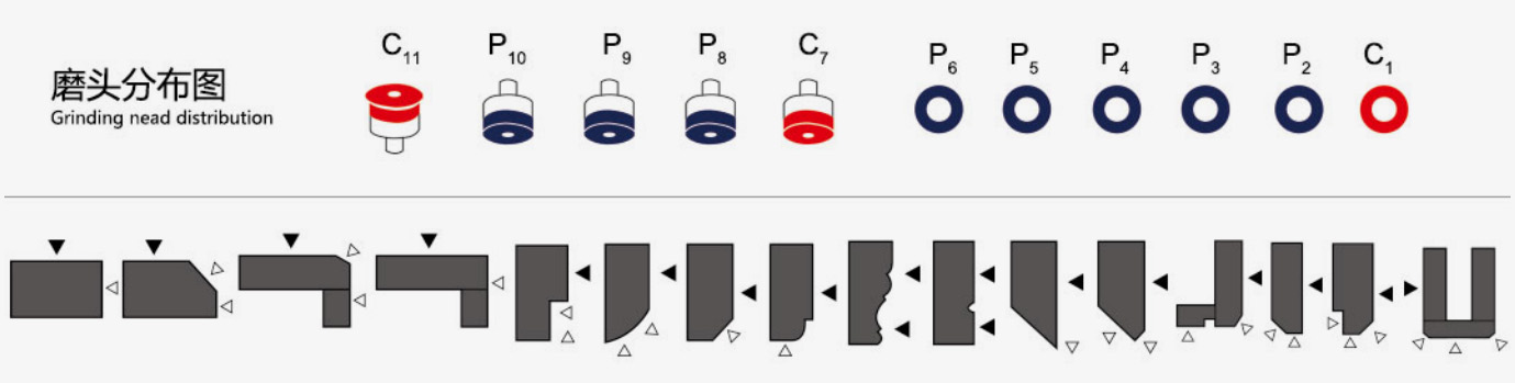 該機采用水磨片加工,配置蝸??诮宇^,電動調(diào)節(jié)電機前后移動、升降,可加工各種尺寸、厚度平板石材的直角底邊、加厚直邊見光、直線底邊45°倒角、直邊成型、海棠角背切,并一次性完成粗磨、精磨和拋光工序,加工后亮度高于板面亮度。該機結(jié)構(gòu)先進合理、精準(zhǔn)度高、效率快、操作方便、維護簡單,磨削過程中可調(diào)節(jié)進料速度和進行量,最大加工速度5M/分鐘,并杜絕出現(xiàn)人工加工時產(chǎn)生的工藝缺陷。